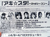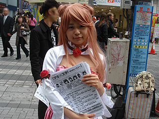 毎日イベントが開かれるというのがウリという「アキ☆スタ~2ndシーズン」のチラシ配布風景。チラシを配布していたアミィさんはTVアニメ「コードギアス反逆のルルーシュ」の「ユーフェミア・リ・ブリタニア」の衣装を着ていた。見かけたのは4月7日(土)。 「アキ☆スタ~2ndシーズン」は新人アイドルイベントで、4月9日(月)~5月3日(木)の平日(月~金)に毎日開催されるのが特徴。イベント内容はトークやゲームに加えて撮影タイムが用意されている。出演者は毎日変更される予定。参加費は1,500円でカメラ持ち込みの場合は追加で1,000円必要になっている。イベント会場は石丸電気ゲームワン 6F。