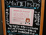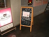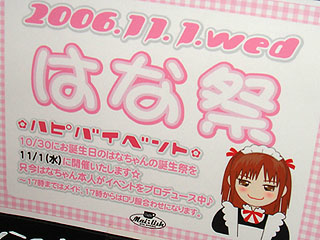 メイリッシュのメイドさん「はな」さんの誕生日を祝って行う「はな祭」の開催告知看板。11月1日(水)17時から開催。 「はな祭」は、はなさん自身がプロデュースしたとされ、メイドさんが「ロリータ服」姿で接客するのが特徴となっている。限定ラミカ付メニューも用意されているという。 看板では「はな」さんはネコのようにかわいいともされている。そのためか店内はネコに関連したものも多数用意されていたらしい。イベントを報告している公式webスタッフ日記によるとロリータ服 + ネコミミ姿で接客していたメイドさんもいたり、店内ではネコのDVDも放映していたとか、かなりラブリーだった様子。 前日に行われたハロウィンイベントで恐怖キャラクターの姿で接客していたのと比べるととんでもないギャップがある。 ちなみに「ロリータ服 + ネコミミ」と聞いて少女漫画「綿の国星」のチビ猫を思い出すのはダメ人間っすか? メイド喫茶カフェメイリッシュ(Cafe Mai:lish) □関連記事 (k)
