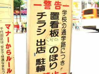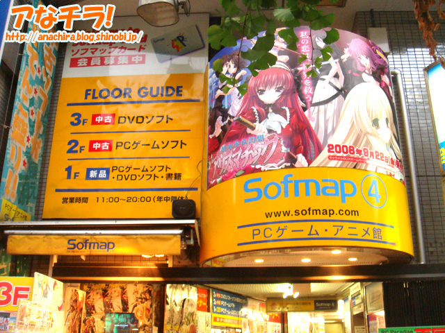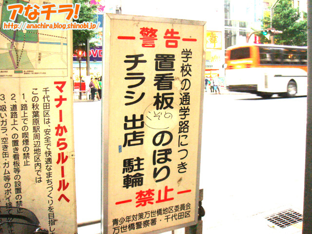 んが、この看板が本当に禁止したいのは違うと思われる、なぜならばこの看板の正面店舗がPCゲーム/フィギュア専門店「ソフマップ4号店」だからだ、この店舗の店先ではギャルフィギュアや18禁ゲームの宣伝が画像入りで常時行われているほか、看板やPOP、時にはプロモーション映像が流されたりもしている。ギャルフィギュアは最近ますます性的表現があらわになってきているし、18禁ゲームは登場人物の幼体化や被虐性が向上しているもんなぁ(ため息)。