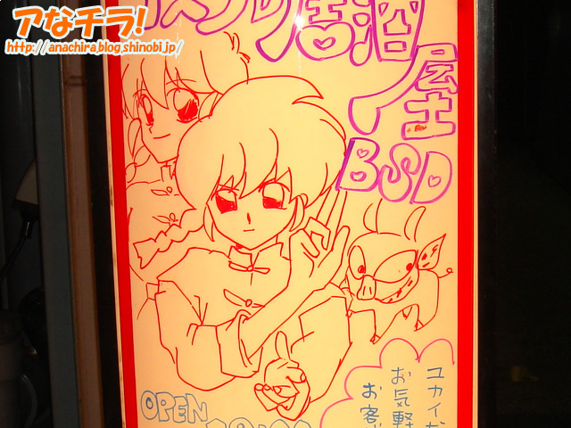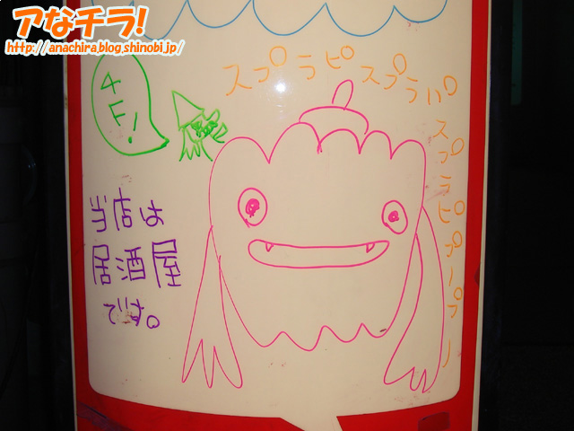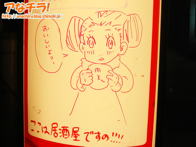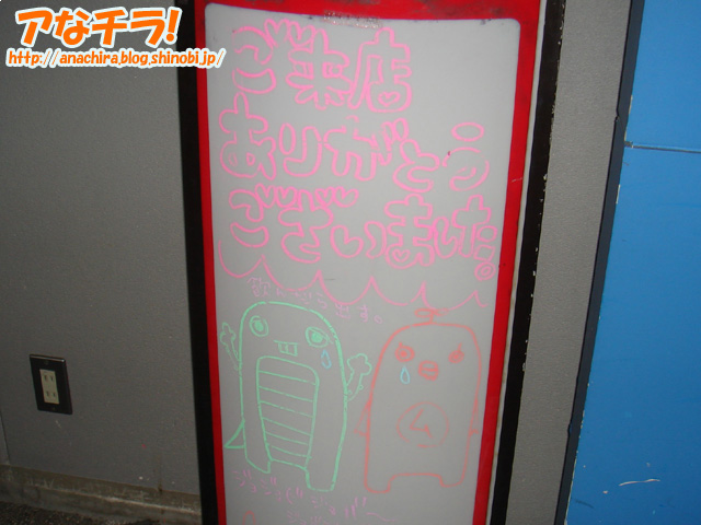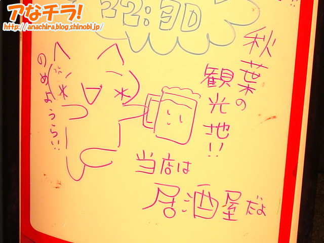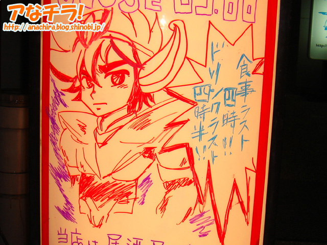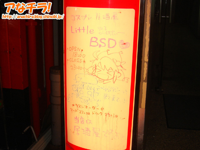 雨で絵がにじんでいた看板。掲示しているのはコスプレ居酒屋「Little BSD」。 看板に描かれていた絵はアニメ「ふしぎ星のふたご姫 Gyu!」のファインとレイン。雨の名前をもじったキャラクター「レイン(青で書かれた絵)」の絵が雨でにじんでいたのがなんとも。 Little BSDの看板は毎日書き換えられていることで有名。今まで紹介できていなかった看板絵を少し紹介。