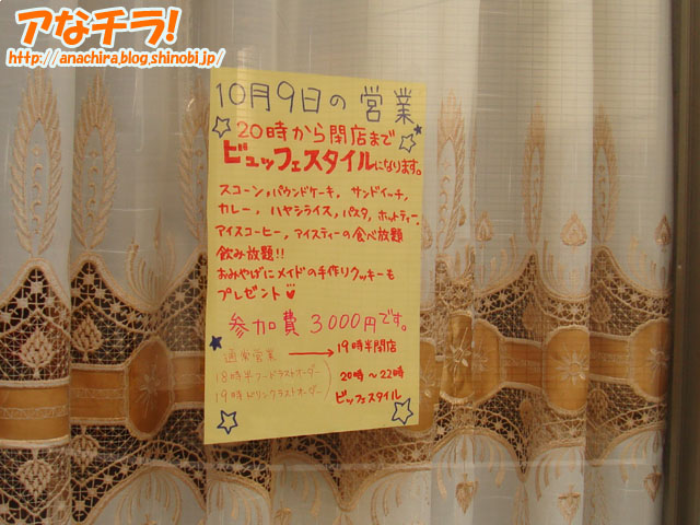 10月9日(月/祝)で閉店するという新宿のヴィクトリアンカフェ「エミリー」に行ってきました。 せっかくなので、紅茶(マリアージュ)とメイドさん手作りのパウンドケーキを頂いてきました。紅茶美味しかったです、また営業を再会される時はお伺いさせて頂きます。 当日は最終日なので、通常営業は12時開店~19時半で、ビュッフェスタイルのパーティー(参加費は3,000円)を20時~22時まで行う予定になっており。パーティには同店で勤務したメイドさんが大勢参加するとされていた。 なお、先日お伝えした時は未完成だった「壁絵」は完成していたのだが、何か広告が張られており完成された姿を見ることは出来なかった。残念。 □関連記事 (k) PR