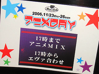 アニメキャラクターの衣装で接客するイベント「アニメDay」の告知看板。メイド喫茶「メイリッシュ」が23日(祝/木)~26日(日)で開催され、毎日服装のテーマが変わるのが特徴だ。 服装のテーマは23日がアニメMIX(17時以降エヴァ合わせ)、24日がジ●リ合わせ、25日が魔法少女合わせ、26日がアニメMIXとなっている。 エヴァ、ジ●リ、魔法少女という選択が10年前のノリに見えます。もしかしたらターゲットを30代前後に絞っているのかもしれない。 メイド喫茶カフェメイリッシュ(Cafe Mai:lish) □関連記事 (k)