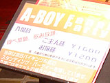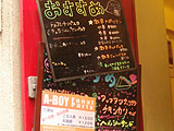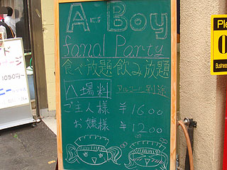 10月14日(日)をもって閉店するTHE アキバ系喫茶「A-BOY」の看板。最終日は通常メニューはなく「食べ放題、飲み放題」コースのみだった。 さて、同店の看板にはネタを貰ってきた恩があるので行ってきました。ちょうどお腹もすいていたので「面白メニューもあるみたいだし(写真の通り看板は出ていた)」と思っていたら、メイドさんから「残念ながら(面白メニューは)ありません」と言われてしまいました。ガックシ↓ 「食べ放題、飲み放題」コースは立食形式で食事はテーブルに出されているモノを自由に食べられ、飲み物はメイドさんにオーダー(アルコール類は300円/1杯の追加料金が必要)。食事で確認出来たのはサンドイッチ、サルサ、フライドチキン、フライドポテト、各種ケーキ。 店内の様子は、最後の別れを惜しむ常連さんばかりで、メイドさんとつもる話をしたりしていた。かなりフランクな状態で、メイドさんの中には「私あしたからニートよ」とう人がいたり、常連さんの中には「酔っぱらったよー」といいながらもメイドカクテルを注文している人もいた。また、別の常連さんはメイドさん達にお土産としてファーナムハウスの「メイドシュークリーム」を渡していたりもしていた。 同店の看板やメニューがユニークなのは知っていたが、常連さんもかなりユニークだった様子。こんなアットホームで楽しいメイド喫茶が閉店するのももったいない気がする。 □関連記事 (k)