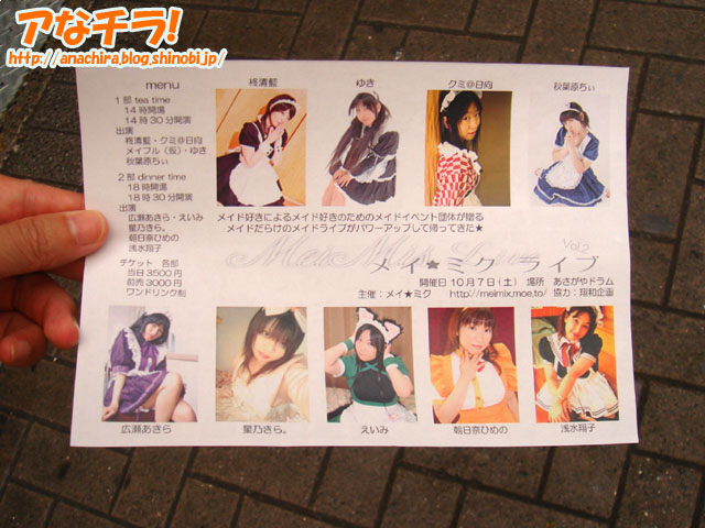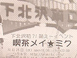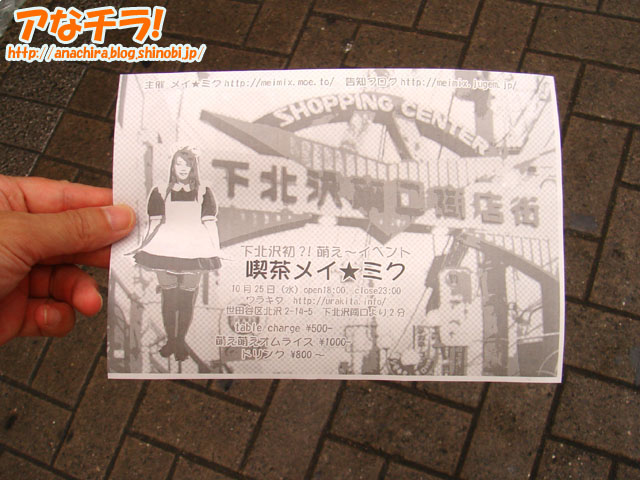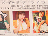 SNS「Mixi」で知り合ったメンバーでメイド喫茶「喫茶メイ★ミク」を開店することを告知するチラシ。下北沢で10月25日(水)限定で運営される予定。下北沢で萌え店舗が運営されるのはこれが初めてという。 代表の浅水翔子さんによると、同店のメイドは全員Mixi内のフォーラム「メイ★ミク」で知り合ったメイド好きのメンバー。「各々メイド喫茶で働いてみたいとの思いもあるが、様々な理由(会社勤めなど)で働いていない」そこで、自分たちで1日限定のメイド喫茶を開いて、メイドとして働こうというものらしい。 また、メイド喫茶としては珍しく「店内でメイドの撮影がフリー」になっており、「メイドが一生懸命に奉仕する姿を撮影してください」とも言っていた。 チラシでは「メイ★ミクライブ」が10月7日(土)に「あさがやドラム」で開催されることも合わせて告知していた。 10月1日(日)にJR秋葉原駅前で、「喫茶メイ★ミク」の開店告知チラシを配布していたメンバーは、全員同店のメイドとして働く予定とのこと。 メイ★ミク (k) PR
