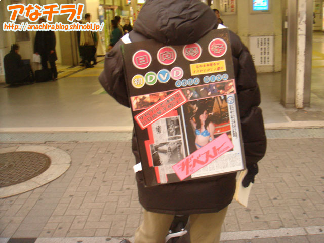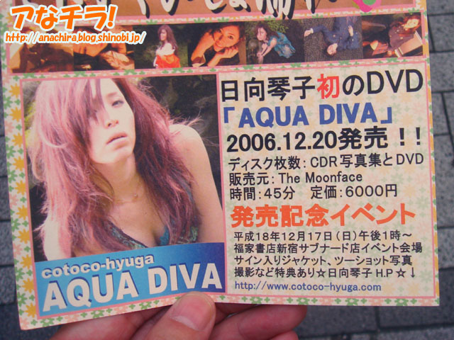 「とにかくびしょ濡れ」というキャッチコピーが目を引くDVD販促用チラシと人間看板。宣伝しているのはレディースコミック作家「日向琴子」さんの初DVD「AQUA DIVA」(6,000円)で、12月20日に発売される。 何が無くてもキャッチコピーがエッチっぽい、最初エロDVDか?と考えてしまったほどだ。内容的にはセクシーDVDなのだと思うがキャッチコピーによって一気に桃色空間に引きずり込まれている。 日向琴子さんはレディースコミックなどで活躍する漫画家で、そのほかにもグラビアやTVコメンテイターとして幅広く活躍している。 今回宣伝しているDVDは販売前に発売記念イベントもある。イベントは12月17日(日)に福家書店新宿サブナード店イベント会場で行われ、サイン入りジャケット、ツーショット写真撮影など特典があるという。 新宿のイベント告知をなぜ秋葉原で行っているのか人間看板さんに聞いたところ、「彼女は漫画家なので秋葉原で知名度があると考えて」と「こういった撮影会イベントは秋葉原にファンが多いと思って」とのこと。 日向琴子公式ホームページ (k)