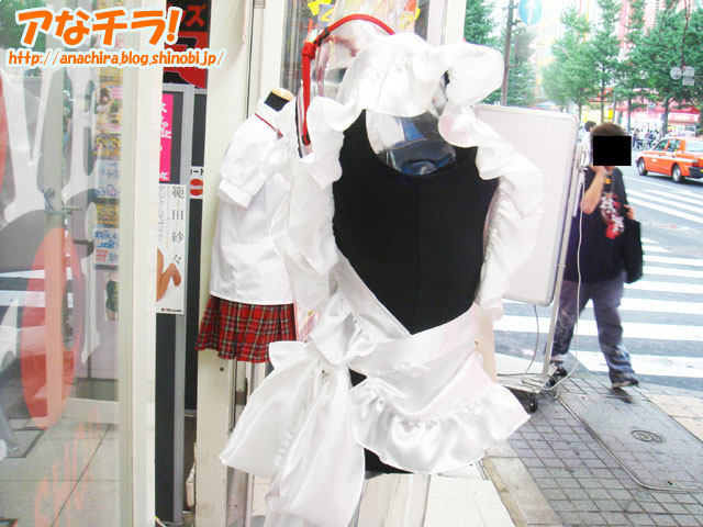 スクール水着に純白のエプロンを重ねた「スク水エプロン」の立体看板がLOVE Meroiの入り口に新しく登場。
