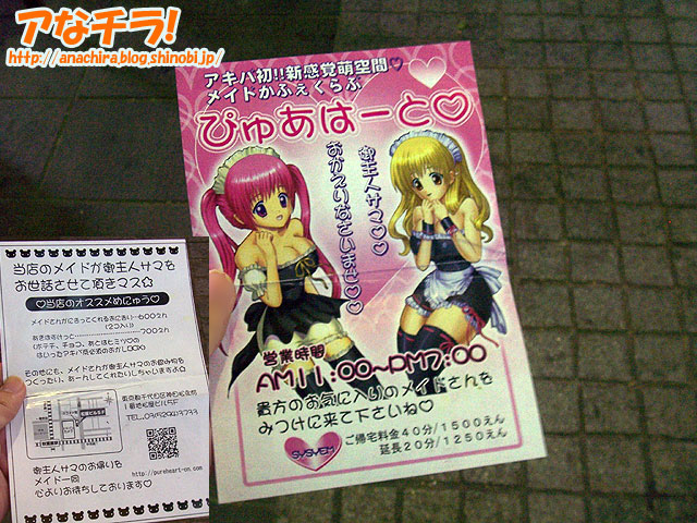 「アキバ初!!新感覚萌空間」をうたい文句にしている「ぴゅあはーと☆」がチラシを配布中。チラシに大きく描かれた肌露出の多い美少女メイドのイラストが目をひく。ここはメイド姿の女性が勤務し、指名すると一定時間“あなたのためだけに”奉仕するというお店で、まぁ端的に言えばメイドキャバクラだ。営業時間が11時~19時と早い時間帯であることを考えると、言わば広義の昼キャバの範疇に入るのだろう。 オープンしてからしばらく経つ店だが、改めてチラシで内容を見ると、確かにいろんな意味で“新感覚”ではある。だいたい業態を「メイドかふぇくらぶ」と宣言していて、カフェでもなくキャバクラでもないというところが、新しいと言えば新しい。まぁ「メイドかふぇくらぶ」という名前は、実のところカモフラージュなのだろう。キャバクラと言うと、一般に風俗のジャンルでイメージが悪く、従業員確保と秋葉原の夜遊び慣れしていないオタク層を取り込むには別の名が要る、というわけだ。 新感覚と言えば新感覚だが、謎めいた怪しい雰囲気がするのも確か。なにしろ、キャバクラや風俗系店舗とはうたっておらず、18歳未満入店禁止の断りもチラシにはないのに、イラストはお色気系だし、料金は完全時間従量制。そしてお店の場所も居酒屋や水商売系店舗の多い昭和通りだ。 チラシの裏にはメニューとして、「メイドさんがにぎってくれるおにぎり2コ入り 600円」「アキバ系必須のおかしBOX あきばすけっと 700円」「その他にも、メイドさんがご主人サマのお飲み物をつくったり、あーんしてくれますよ」とあり、これだけみると、メイドカフェとも思える。チラシには出ていないが、カフェと決定的に違うのは、メイドが隣に座って話をしたり飲食の世話をするところ。ま、普通のキャバクラで女性キャストがメイドになっているという、実はそれだけの話なんだが。 料金は40分1,500円で延長20分1,250円。さらに本指名料として2,000円、場内指名料は1,000円、もちろん飲食オーダーは別料金。キャバクラとしては安いが、ここでオーダーをかけさせるのがカフェとしての便利な位置づけなのだろう。 ちなみに、このチラシには、キャバクラと書いていないうえに、指名料や延長料のことも一切書いていない。たぶん、それを書くとキャバクラだと一発でわかってしまうからだろう。ここもカモフラージュというわけだ。詳しい料金体系と18禁の断りやマッサージというメニューも、ホームページにだけ書かれている。ちなみに、働くメイド達は顔出しでブログを更新中だ。働いてる側も、水商売・風俗店と一般に認識されているという意識が薄いのかも知れない。 ぴゅあはーと☆ (f) PR