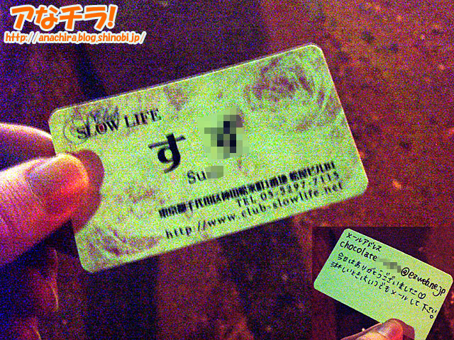 19日(木)の夜、またまた秋葉原の路上で拾ってしまった…ランパブ嬢の名刺。8月に1回、10月に2回で、たった2ヶ月で3回目のことだ。別に探しているわけではなく(笑)、普通に歩いていると目立つところに捨てられているんだな、これが。相変わらず秋葉原の夜遊びマナーは最低だ。 今回拾った場所は、秋葉原でも極めて交通量の多いJR秋葉原駅の昭和通り口から昭和通りを横切る横断歩道のど真ん中。8月の時と同じランジェリークラブSLOW LIFEの名刺で、名前は「す○」(○は伏せ字)。名刺の裏にはしっかり営業用メッセージとして「メールアドレス chocolate○○○○○@ezweb.ne.jp 今日はありがとうございました。寂しいときはいつでもメールして下さい。」と手書きされていた。こんなところに名刺捨てられちゃって、淋しいのは君だっちゅうの!と思わず突っ込みたくなるところだ(笑)。 Winnyで個人情報が流れて問題になっているが、個人のメールドレス付き名刺が路上に捨てられるのだから、これだって似たようなものだ。水商売女性といえど、ケータイのアドレスは個人のものなので、いたずらでもされたら大変だ。名刺は破くか燃やすかして捨てる。教科書なんかにゃ出てないが、それが夜の大人の基本的マナーですわ。 秋葉原ではランパブやキャバクラがここ数年で急に増えたので、客が未熟でマナーが追いついていないのか?そろそろ、店側も何か対策を考えた方がいいかもしれない。かなりえぐい営業手法だが、名刺にメールアドレス書いて待つのではなく、席で客のケータイアドレスを聞いて、その場でメールして届いたかを確認するよう女性キャストに指導したらいかが。これで客のリピート率もぐっと高まるってもんだ。 手を取って客の手に連絡先をサインペンで直接書いてしまうというのもいいかも。これは新しい。西川口流ならぬ、秋葉原流の営業ってことで(笑)。 ランジェリークラブ SLOW LIFE □関連記事 (f) PR