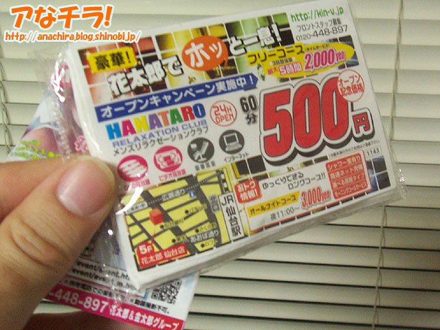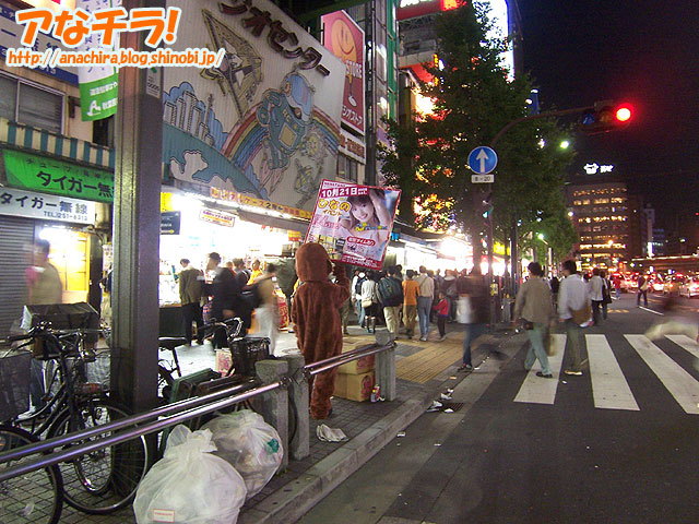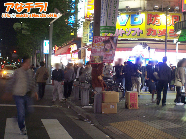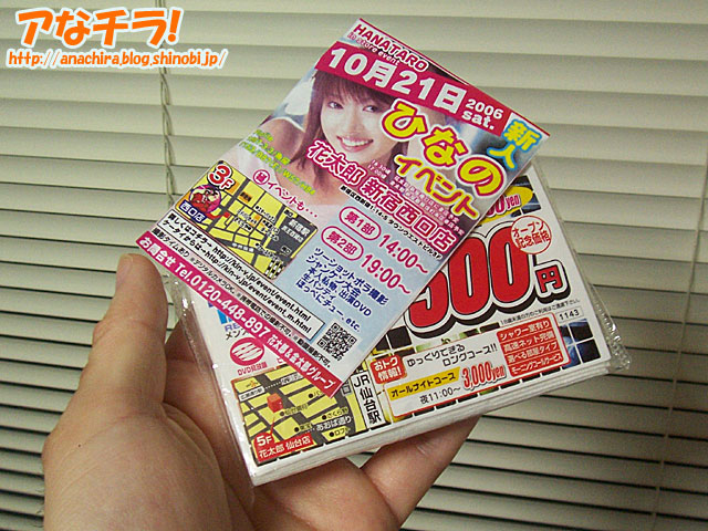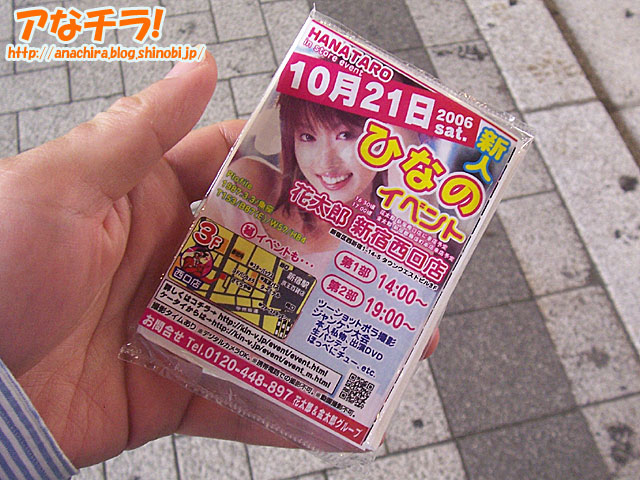 14日(土)の夕方、中央通りの横断歩道がある総武線ガード下でAV女優イベントの告知チラシが配られていた。微妙なところで目新しい点があったので紹介しよう。 配布していたのはビデオボックス店「花太郎」新宿西口店で新人AV女優「ひなの」のイベントが行われることを告知するティッシュペーパーで、その配布方法と内容に秋葉原とは違う文化を垣間見ることができた。 そもそも総武線ガード下の横断歩道すぐそばで配るというのが珍しい。人があまりに多く、遠慮がちにその近くでやることはあっても、堂々と信号待ちの人だかりの場所でやる例はさほど多くない。さすが秋葉原アウトサイダーは思い切りがいい(笑)。 さらにゴリラの着ぐるみが看板を持ってアピールしていたこと。メイドやナースなど可愛いイメージのコスプレで配るのが秋葉原では基本だが、無骨なゴリラの格好で大きな看板持つという感覚もどこか“新宿風”だ。 もう一つは、ティッシュペーパーの使い方。受け取ったティッシュには当然ながらイベントを告知する紙が入っていたのだが、なんとこれ、よくみると紙が2枚入っていて、イベント告知の下にはすでに終了している仙台店のオープンキャンペーンを告知する紙が入っていた。つまりこれ、キャンペーン期間が終了して使えなくなった仙台店のティッシュを東京まで移送し、さらに“化粧直し”して使っているというわけ。有効利用という意味では大胆にして極めて合理的な方法だ。 仙台店の紙は袋の内部に入りこんで取り出しにくい状態になっているため、それを取り出すことはせず、AV女優イベントの紙を袋の隙間から挟み込んで重ねているだけ。しかし、内部に賞味期限切れの本来のチラシが入ったままで使ってしまうとは、これも新宿風俗文化のクオリティなのか。 イベントは「ひなの」が登場して、トークやツーショット写真撮影のほか、じゃんけん大会で「ほっぺにちゅー」「生パンティ」がもらえるそうな。 ネクストイレブン専属女優 ひなのちゃんイベント決定! (f)