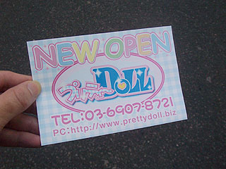 26日(日)に歩行者天国だった中央通りで「NEW OPEN プリティーDOLL TEL 03-6907-8721 PC:http://www.prettydoll.biz」とだけ書かれた小さなチラシを入手した。コスプレ姿の女性が配っていた(確か黒のメイド服だったような…)。 全体に水色やピンク色で構成された可愛い感じのデザインだが、とにかくこれだけではなんのことだかぜんぜんわからない…。だが、実はそれがこのチラシの戦略なのだった(笑)。 早速なんだろうとPCでURLを入力してみると、制服姿のハルヒ、巫女、メイドといった姿の女性写真がずらり…。そして「池袋西口アニコス☆ゲーコス専門完全素人イメクラ 『プリティードール』」「2006年12月1日 GRANDOPEN!!」というメッセージが。 そう、これは12月に新規オープンするコスプレ風俗店の宣伝だったのだ。しかも池袋の。アニメやゲームのコスプレをした女性が相手をするイメクラ、ということらしい。風俗店とチラシに書いてしまうと、多くの人がすぐ捨ててしまうので、メイド喫茶かなにかと勘違いさせるつもりだったのだろう。そして秋葉原はアニメとゲームのオタクの集まりなので、そこから客を引っ張ろうというわけだ。 ちなみに、同店のホームページは現時点ではまだトップページのみしかなく、料金や在籍女性の情報などは一切ない。アクセスカウンターを見ると合計5,240で27日(月)だけで1,335あったというから、これもチラシの効果か。 アなチラ!のメンバー(k)の情報によると、池袋にはこの手のお店は前から結構あるらしいので(なぜ彼が池袋の風俗に詳しいかというと…以下省略)、これが成功すると続々と池袋風俗店のチラシ配りがやって来るかも。 プリティドール (f)