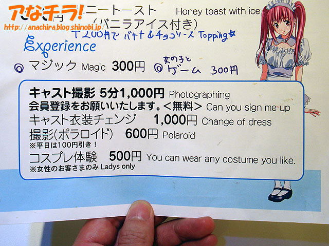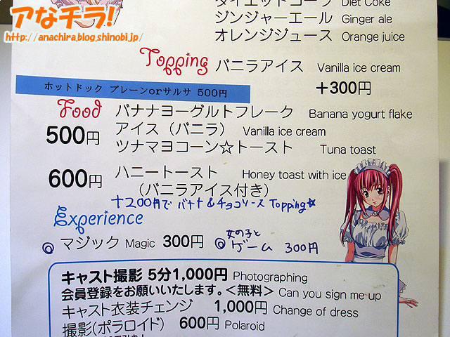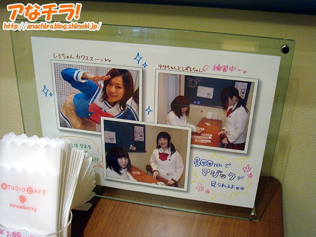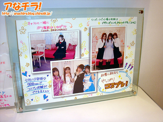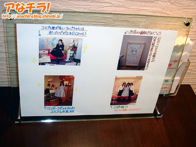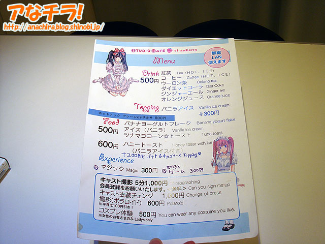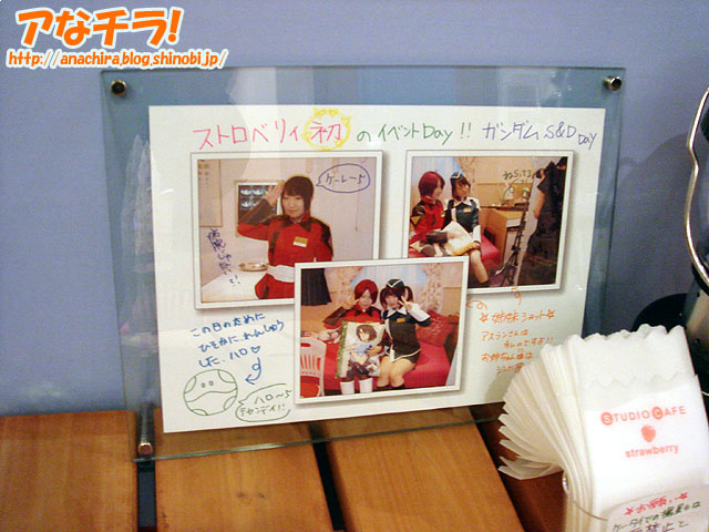 「スタジオカフェ・ストロベリィ」に新サービスが登場。開店時から予告していたとおり「無線LAN」サービスを開始したほか、「ホットドック」などのフードメニューや「女の子とゲーム」が用意された。 また、各テーブルにちなんだ食器や、スタジオカフェらしく写真立て、店名ロゴの入った足ふきマットなども導入。 同店スタッフに聞いてみたところ、新サービスは大旨好評のようで「マジック」や「コスプレ体験」などは毎日のように注文があるとのこと。「コスプレ体験」の衣装はアニメ衣装よりもロリータ服やメイド服が人気が高いという。また、新サービスの内容はまだまだ改善中で、状況によって変更する場合があるとのこと。 ここで紹介したもの以外はお店でご確認下さい