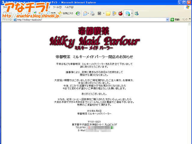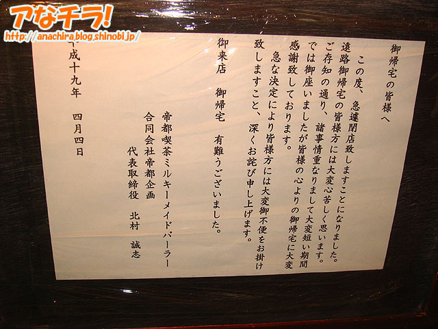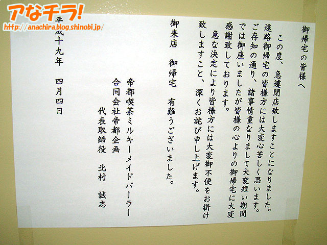 4月3日(火)の営業を持って「ミルキーメイドパーラー 帝都喫茶」が閉店。閉店のお知らせは4月4日(水)に同店Webサイトに掲載されたもので、閉店の挨拶と利用客へのお礼が記されていた。 同店は同人誌とのコラボレーションという新機軸をもった正統派メイド喫茶として今年2月5日の開店、3月には開店時間を変更したり、「男装」「花見」など様々なイベントを実施してたりもしていた。営業期間は約2ヶ月。 最終営業日の看板は「あたたかいお茶でゆっくりしてみませんか?」と通常と変わりない雰囲気。事前に閉店情報を出さなかったのは、同店のゆっくりとした雰囲気を最後まで損なわないためだったのかもしれない。 ミルキーメイドパーラー 帝都喫茶 □関連記事 (k)