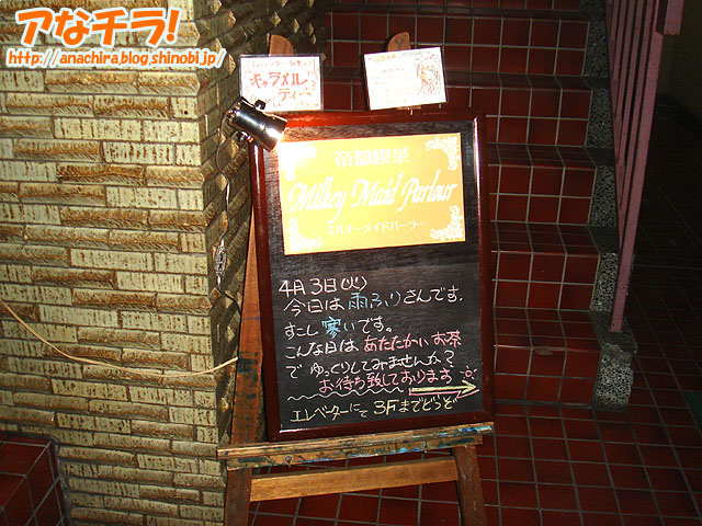 「今日は強い雨がふっていましたね、桜もそろそろ見納めでしょうか」という季節の移り変わりに名残を惜しむような看板です。メイリッシュのメイドさんは感性が豊かで羨ましいです。 看板を見かけた4月4日(水)は2日続けて雨で、特に夕方の雨は酷かった。 メイド喫茶カフェメイリッシュ(Cafe Mai:lish) □関連記事 (k)