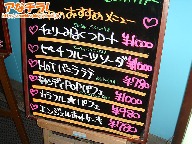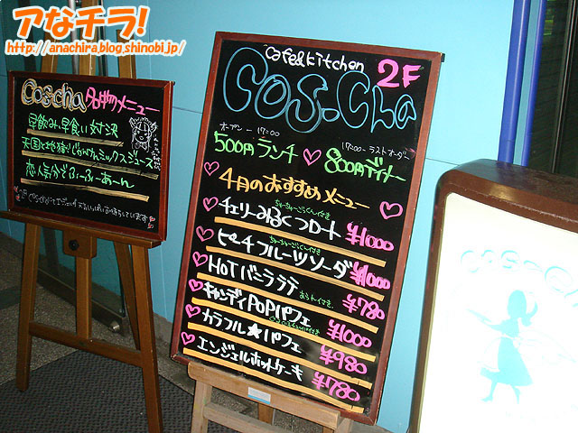 4月のおすすめメニューが書かれたカフェ&キッチン「コスチャ」の看板。4月2日(月)に発見。春らしいネーミングのメニューが多いのが特徴。 メニューは「チェリーみるくフロート」「ピーチフルーツソーダ」「HOTバニララテ」「キャンディPOPパフェ」「カラフル★パフェ」「エンジェルホットケーキ」。 季節限定と思われるメニューがあるので、興味のある方はお早めに。 カフェ&キッチン コスチャ(Cos-Cha) □関連記事 (k)
