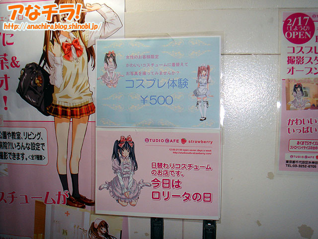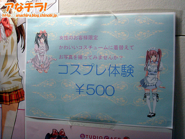 好きなコスプレ衣装を着て写真撮影が出来るという「コスプレ体験」(500円)のPOP。開催しているのは「スタジオカフェ・ストロベリィ」で、女性限定サービス。 用意されている衣装のサイズはSサイズのみ。 このサービスを利用して店内で撮影する場合に、利用者が撮影クラブに入会する必要があるのかは不明。 スタジオカフェ・ストロベリィ (k)
