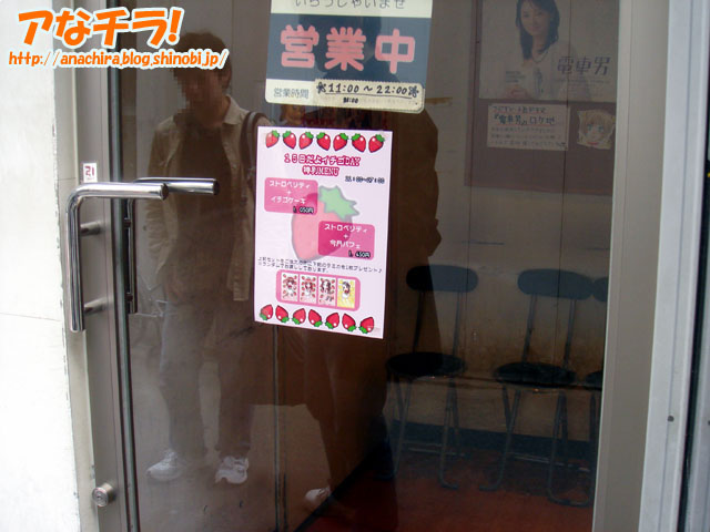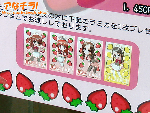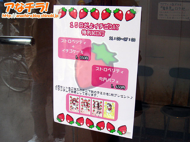 メイドカフェ「ぴなふぉあ」が開催した突発イベント「15日だよイチゴDay」のPOP。特別セットメニューを注文した方には限定「イチゴ星人」のラミネートカードをプレゼントしていた。開催日は3月15日(木)。 特別セットメニューは「ストロベリティ+イチゴケーキ(1,050円)」と「ストロベリティ+今月のパフェ(1,450円)」の2つ。ラミネートカードはPOPで4種類が確認されており、内容はイチゴが背景の「いちご星人」「いちご星人1号」「いちご星人2号」とレモンが背景の「いちご星人にせ」。 イベント自体もそうだが専用ラミネートカードに「にせもの」を用意しているなど、相変わらず客の心をつかむのがうまい。 メイドカフェぴなふぉあ (k) PR