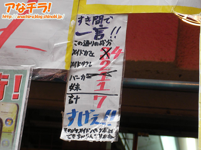 メイド喫茶「Cute-M」が3月2日(金)~4日(日)に開催した開店一周年記念イベントのPOP。同店の開店日は2006年03月04日(土)。 イベント期間中はメイドさんの出勤者が通常よりも多く約20名で接客するほか、1周年限定メニューも用意していた。また、「みんなでモジモジしながら撮って参りましたw」(Cute-MのWebサイト)という萌え仕様の写真付きメッセージカードも配布。そのほか、後日プレゼントと引き替え出来る一周年記念ポイントラリーや特別なイベント(3月4日限定)も行われたという。 アなチラ!としては、同店が1階看板にPOPを貼り出したのを確認したのは今回が初めて。控えめな宣伝ながら、このPOPからは1周年を迎えた歓びが溢れているのを感じる取ることが出来た。 (k)
