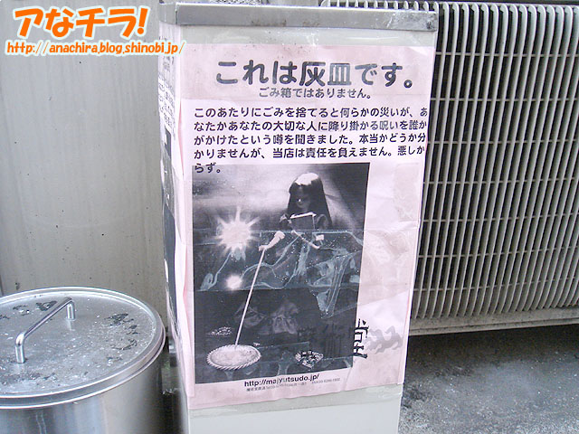 「魔法陣を描いている人形」の写真が特徴で、「ごみを捨てると災いがふりかかると」という警告文POPが貼られた2つめの灰皿。場所は秋葉原のとある喫煙所。 警告文が貼られていた1つめの灰皿も同じ場所に設置されていたが、先日有志一同から寄贈されたという今回の新しい灰皿に置き換わっていた。なお、寄贈当初は警告POPは貼られていなかった。 □関連記事 (k) PR