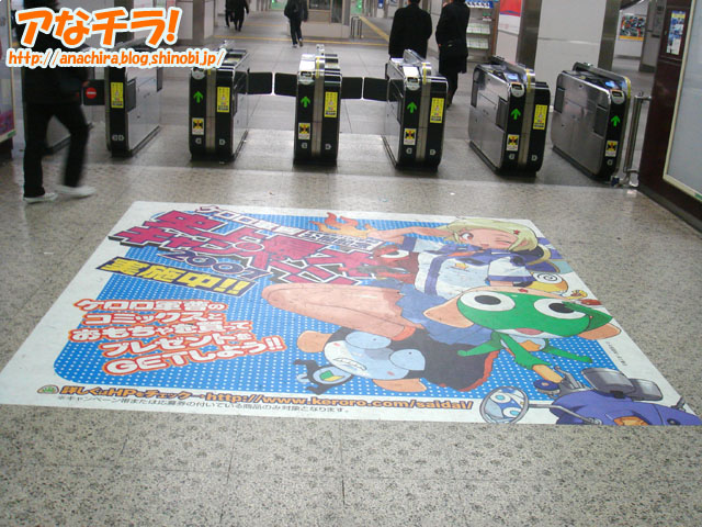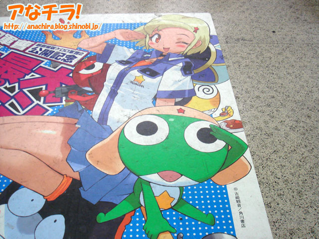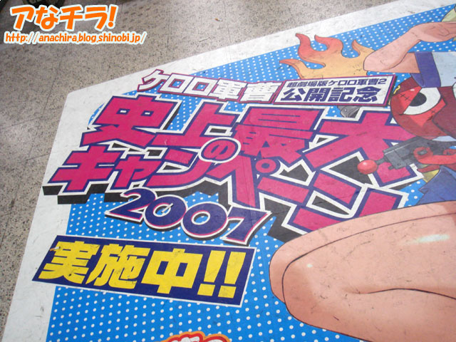 JR秋葉原駅の踏み絵広告がケロロ軍曹になっていた。踏み絵は劇場版ケロロ軍曹2公開記念として実施されている「ケロロ軍曹 史上最大のキャンペーン」実施を告知するもの。 「ケロロ軍曹 史上最大のキャンペーン2007」は対象商品に付いているケロロマーク5点を集めて応募すると合計2007名に豪華景品があたるというもの。3名に当たるケロロ賞はケロロ軍曹がイベントに来てくれるというもので、50名にあたるアフロ賞はケロロ軍曹のマスコットをプレゼント、そのほか巾着やキーチェーンマスコットが貰える。 告知踏み絵イラストで一番大きく書かれているキャラクターが主人公のケロロ軍曹ではなく、美少女のモアなのは秋葉原的なマーケティング結果だと思われる。 ケロロ軍曹 史上最大のキャンペーン2007 http://www.keroro.com/saidai/index.html (k)
