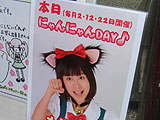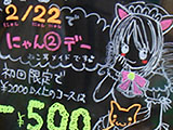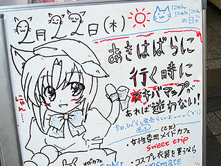 秋葉原に来て最初に目にしたのはアキバガイドの猫イラスト看板、可愛いなーと思いつつ見てみれば上にある2月22日の日付まで猫仕様。どうやら語呂合わせで「2月22日→にゃんにゃんにゃんの日(猫)」ですよとしているらしい。 これを見て今日は萌え系店舗ではさぞかし猫イベントが行われているだろうと期待したのですが・・・結果は2店舗。猫イベントは耳イベントや動物イベントとして日頃から行っているからあまり注目されなかったのかも。ちょっと寂しい。 猫イベントを開催していたのは「メイリラックス東京」と「めいどinじゃぱん」。 アキバガイド (k)