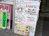 昭和通り側で先日リニューアルオープンしたばかりの出会い系喫茶「MAX秋葉原」の看板が迷走している。半年強の間に「akiba系chat plaza ◇akiba◇Mixy◇maid◇」から「Mixy 秋葉原店」へ、そして新たに「MAX秋葉原」と3回も改名した同店は、看板の移り変わりもなかなか早い。 オープン当初、ビル前に置かれたA型スタンドは前店舗の写真付きのものに即席デザインの貼り紙をつけただけの状態で、これはその後クオリティを高めるための暫定的なものだろうと想像させたが、実際にはさらにシンプルな貼り紙に替わり、よりいっそう安っぽさが増幅される妙な結果になっている。さらに、新たな小さなA型スタンドを表通りに出し始めたのだが、これまたずいぶんと低いクオリティで、ここ数日に2度もスタンドが変更されるなど、なにやら混迷している様子。 ビル前のA型スタンドは今現在、白地に文字があるだけのシンプルなデザインのもので、ところどころ重要なキーワード部分だけが黒地に白の反転文字になっている。前代の「Mixy 秋葉原店」時代は少なくともモデル女性の写真付きの内容である程度はデザインされていたが、今はなんとも葬式を思わせる暗いイメージで怪しさ爆発である(いや、もともと怪しいんだが)。 店舗が昭和通りから浅草橋寄りに中へ入った場所にあるため、よりたくさんの人に知ってもらおうと思ったのか、昭和通りに面した場所にも看板スタンドを出し始めたのだが、これまた妙なことになっている。一度は膝下程度の小さなA型スタンドを置き、そこに同じシンプルな貼り紙を出していたが、数日たって、それではサイズが小さく目立たないと判断したのか、今度は2代前の「akiba系chat plaza ◇akiba◇Mixy◇maid◇」で使っていた小型の電光看板を持ち出し、そこに貼り紙をつけている。これが貼り紙と看板のサイズがまったく合っていないため、もう違和感ありまくり。しかも、こちらの貼り紙では店舗名が「MAX秋葉原」ではなくて「Max mixy CAFE ミクシィ」と別物になっていて、なにがなにやらもう大混乱である。 テレビ電話で女性と話すコーナーも用意された出会い系喫茶というビジネス形態も妙だが、看板のセンスもなかなか妙である。 □MAX Mixy (f)