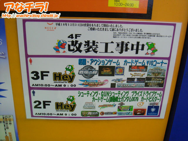 今年1月に閉店したNecca秋葉原店の跡地にゲームセンターHeyが入るとのこと。Heyの新フロア開店日は2月24日(土)。 □関連記事 (k)