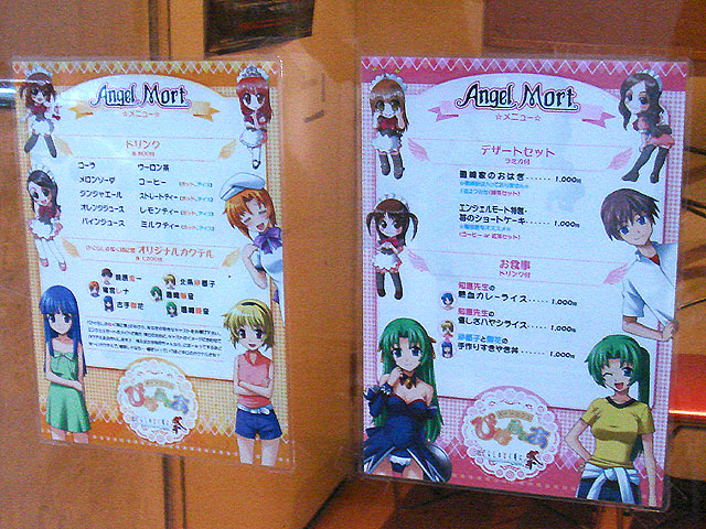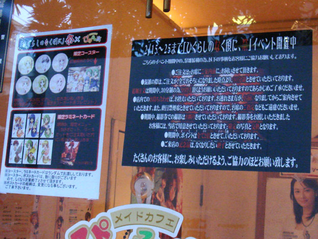 「ひぐらしのなく頃に祭」のイベントをメイドカフェ「ぴなふぉあ」が2月15日~25日に開催。期間中はメイド服でなくゲームに登場する「エンジェルモート」の衣装で接客するほか、限定メニューを用意している。 「ひぐらしのなく頃に祭」は連続怪死事件を題材に使ったちょっとダークな内容となっている。その世界観を演出するためか店の照明は薄暗くされたり、注意書きなども黒をベースに白と赤で書かれたりしている。 メイド喫茶のイベントで陰気な演出をするのは珍しい。 メイドカフェぴなふぉあ (k)