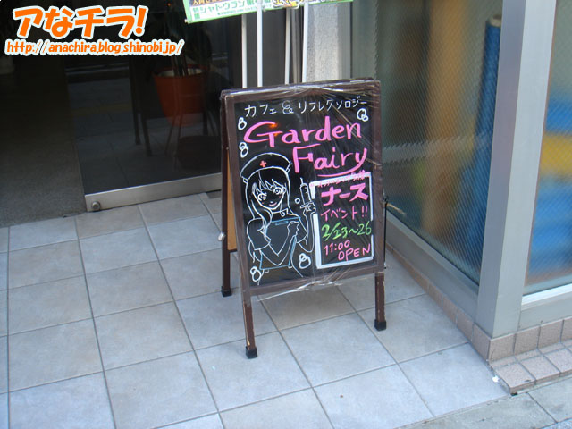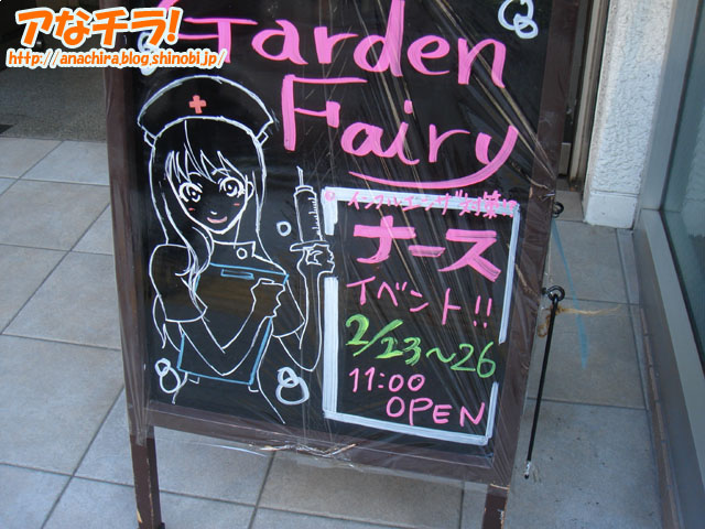 ナース衣装で接客するという「ナース」イベントの告知看板。2月23日(金)~26日(月)にガーデンフェアリーが開催する予定。看板では「インフルエンザ対策!?」とされている。 「病は気から」という諺があるように、「このイベントに行くためにはインフルエンザに感染していてる場合ではない」と気合いを入れていたら健康体を維持できるかもしれない。ただし、張り切りすぎればインフルエンザの為ではなくナース(メイドさん)に接客されて「お熱」になってしまう可能性もあるので注意。 ガーデンフェアリー (k) PR