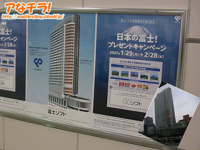 1社占有のビルとしては秋葉原の再開発区域で最大となる富士ソフト本社ビルが2月5日(月)に竣工し、JR秋葉原駅構内にはキャンペーンポスターが貼られている。題して「日本の富士!プレゼントキャンペーン」。民間企業が秋葉原に本社ビルを建てたという理由で大規模キャンペーンをうつのは、これがおそらく初だろう。 キャンペーンは1月29日(月)~2月29日(水)の期間で行われ、「ITを変える、ITソリューションベンダー ○○ソフト」の伏せ字部分をWebサイトで答えると、富士と名の付く山(蝦夷富士、富士山など)の名湯の旅館・ホテルのペア宿泊券がもらえるという。 しかし、このキャンペーンに一体どんな狙いや意味があるのか、実のところ秋葉原界隈の人間にとってもよくわからないのが正直なところ。周囲の反応とはあまりに温度差がありすぎるのだ。 富士ソフト本社ビルの外観自体はすでに数ヶ月前にはできあがっており、ライトアップや窓一面を使った3D広告など独自のキャンペーンを継続してやっているが、これまでほとんど話題にすらなっていない。とりたててビルの形状が変わっているわけでもなく、正面入り口もJRのガード下付近の掘り下げた“微妙な場所”にあり、内部は一部公開されるにしても基本的には一民間企業の本社ビルに過ぎず、飲食店があるわけでもなく、周囲からすれば「だからどうした?」いうのが本音。 そもそも「竣工した」と言っても、正面入り口にはガードがかかっており、まだ一切実働していないため、悪く言えば活気のない幽霊ビルの状態。その状態でキャンペーンをはられても、意表をつかれて「は?」というところ。 莫大な建設費用を考えれば、このキャンペーンの費用などどうということはないのだろうが…。このキャンペーンは当選確率の高い事例として、懸賞マニアに注目される可能性はあるかもしれない。 日本の富士!プレゼントキャンペーン(富士ソフト) (f)