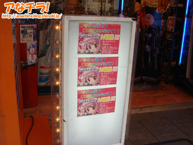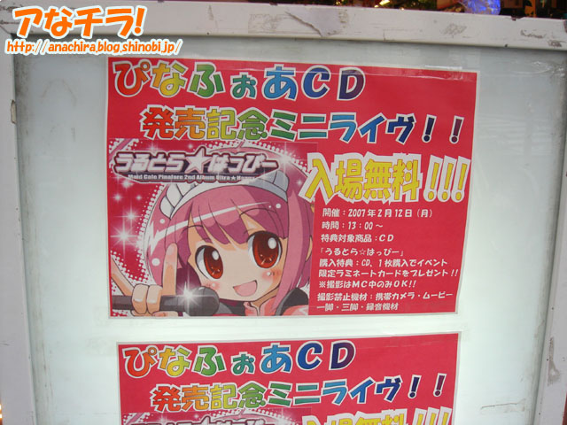メイド喫茶「ぴなふぉあ」メイドユニットの無料ライブ「無料バレンタインライブinラムタラ」を告知するPOP。CD「うるとら☆はっぴー」の発売を記念して行うもので、日時は2月12日(月)の13時で、場所はラムタラの7階。 ライブの内容は、バレンタイン直前ライブ、MCなど、撮影はMC中のみ可能とされている。また、CD購入者へはラミネートカードがプレゼントされる。 この手のイベントは通常入場条件としてCD購入などが必要となっていたが、それをフリーにするというのは珍しい。これはライブ名にもなっているとおりぴなメイドからファンへのバレンタインプレゼントなのだろう。 ちなみに、このライブはぴなメイド「みつ」さんの卒業直前イベントにもなっている。 メイドカフェぴなふぉあ (k)