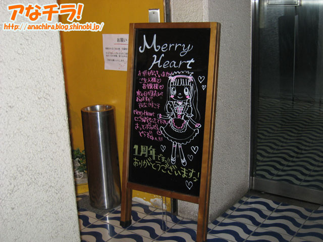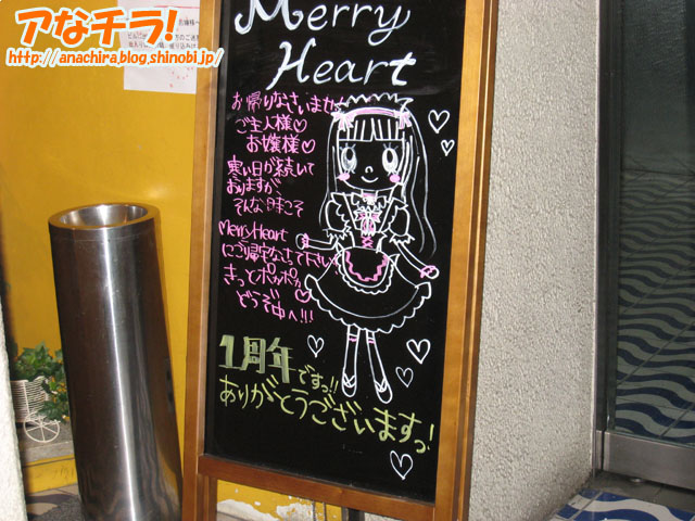 末広町側にあるメイド喫茶メリーハートの開店1周年を告知する看板。同店はメイド型のアンドロイドが働くというコンセプトの店で、昼はメイド喫茶、夜はバーになっている。 看板は可愛いメイドさんのイラストが描かれており「1周年ですっ!!ありがとうございます」と感謝の言葉も書かれている。 秋葉原メイド喫茶 MerryHeart (k)