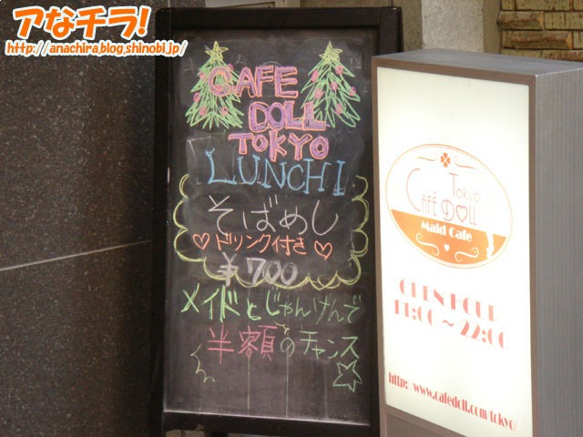 クリスマスツリーのイラストが描かれた看板。カフェドール東京のランチ面で発見。 最近様々な萌え系店舗でクリスマス雰囲気溢れる装飾を見かけるようになった。12月最大のイベントが近づいてきていることを実感できる。 また、同店は店内もクリスマス仕様になっている。写真で紹介できないのが残念。 メイドカフェ カフェドール東京(Cafe Doll Tokyo) □関連記事 (k)