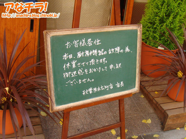 「厨房機器の故障の為、休業」というモスバーガー末広町店の看板。12月11日(月)に確認。 「厨房機器故障」というと、近くにあっていまだに休業中(?)のカレーハウスルンルンを思い出してしまう。 □関連記事 (k)