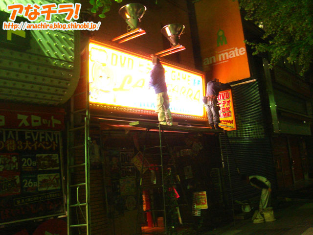深夜2時の看板メンテナンス風景。場所は中央通り沿いのラムタラで、作業は看板周囲に多数配置されている電球を交換するというもの。 あのラムタラの看板に使われている電球が何個あるのかは数えてないが、かなりの数なのは確か。一つ一つ高場で交換しているとは職人様ご苦労様です。寝不足にならないように頑張ってください。