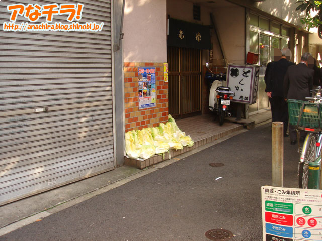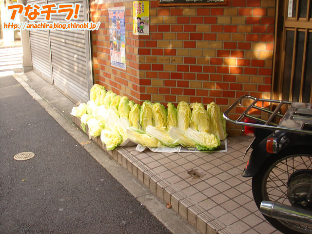 白菜を陰干ししているのを発見。冬は白菜がおいしい季節、漬けものなどにおすすめ。 白菜はビタミンC、カルシウム、鉄、カロチンなどの栄養の宝庫。保存方法も簡単で、1日陰干ししてものを新聞紙などにくるむ、日の当たらない涼しいところに置いておけば1ヶ月は大丈夫です。 田舎などではよく見る光景なのですが、秋葉原のど真ん中でみるとは思いませんでした。 (k)