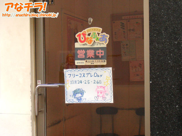 メイド服ではなく思い思いの服装で接客するイベント「フリーコスプレDay」の告知POP。メイド喫茶「ぴなふぉあ」が11月24日(金)~26日(日)で開催中。 同店Webのメイド日記によると、メイドさん達はTVアニメのヒロイン「涼宮ハルヒ」や「蒼星石」、美少女ゲームのヒロイン「涼宮茜」、はては全身着ぐるみの「ピカチュー」や「プーさん」などの姿をしたとのこと。 フリーコスプレイベントは今までも色々な店舗で行われてきたが、全身着ぐるみというのは珍しい。日記の画像で見た着ぐるみ姿のメイドさんはマスコットのように可愛かったので、是非、単独の着ぐるみイベントなどを企画して欲しい。 メイドカフェぴなふぉあ (k)
