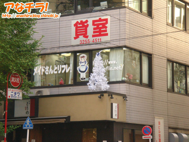 クリスマスツリーを飾っていたメイド系店舗。リラクゼーション「メイドさんとリフレ」が2階という立地性を活かして、1階の下屋根に飾っていた。リラクゼーションの前後などに、メイドさんと一緒にイルミネーション輝くクリスマスツリーを窓から眺めたらロマンチックかもしれない。 クリスマスツリーは白を基調としたシンプルな可愛らしいもので、高さは約1mくらい。電飾が施されており、夜になると電気が灯される。 「メイドさんとリフレ」ではクリスマスイベントとして、12月17日(日)に「メイドさんとクリスマス・カラオケ」(9,500円/3時間)を予定している。 メイドさんとリフレ □関連記事 (k)