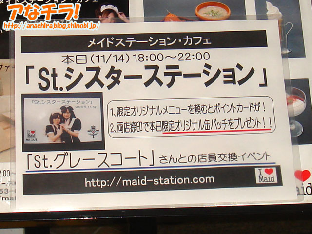 11月イベントを告知しているメイドリフレ「メイフット秋葉原店」の看板。イベントは「メイフットカフェ」と「おいでよ!どうぶつの森」の2つ。 11月21日(火)~26日(日)の「メイフットカフェ」は3,000円以上のコースご利用の方にお菓子とお飲み物のセットをサービスするもの。メイドさんがリフレしてくれた後にお茶のサービスもしてくれるという。29日(水)、30日(木)の「おいでよ!どうぶつの森」は動物カチューシャを着けて接客するもの。メイフットのメイドさんの多くが同名の任天堂DS用ソフトをやっていることから企画されたという。 どれも期間限定なので、気になる方はお出かけしてみてはいかがでしょう。 メイフット秋葉原店(MAIFOOT) □関連記事 (k)