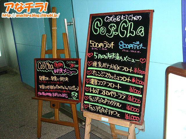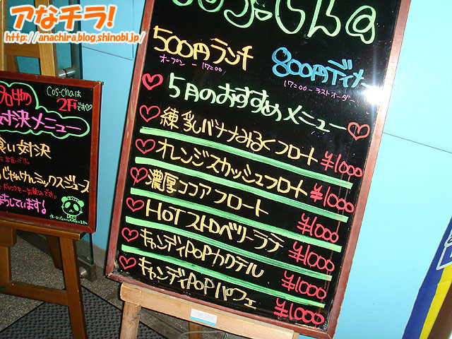 4月のおすすめメニューが書かれたカフェ&キッチン「コスチャ」の看板。5月2日(水)に発見。フルーツ系のメニューが多いのが特徴。 メニューは「練乳バナナみるくフロート」「オレンジスカッシュフロート」「濃厚ココアフロート」「HOTストロベリーラテ」「キャンディPOPカクテル」「キャンディPOPパフェ」。 イチゴやオレンジの食べ頃は5月までといわれてます。コスチャで旬の恵みを味わってみてはいかがでしょうか。 (k)