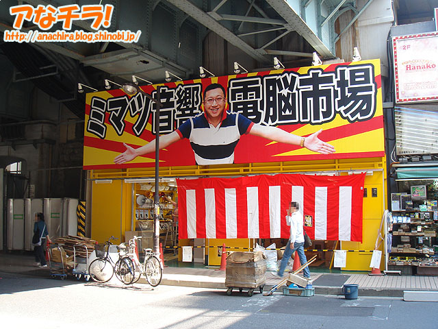 「ミマツ音響電脳市場」という新たな電脳市場が山手線ガード下に建設中。最近萌え系ばかりが元気な秋葉原では貴重な存在ではないだろうか。具体的な開店日などは不明。 目印の看板が「爽やかな笑顔で両手を広げている男性」というのも漢を感じる。 ミマツ音響株式会社