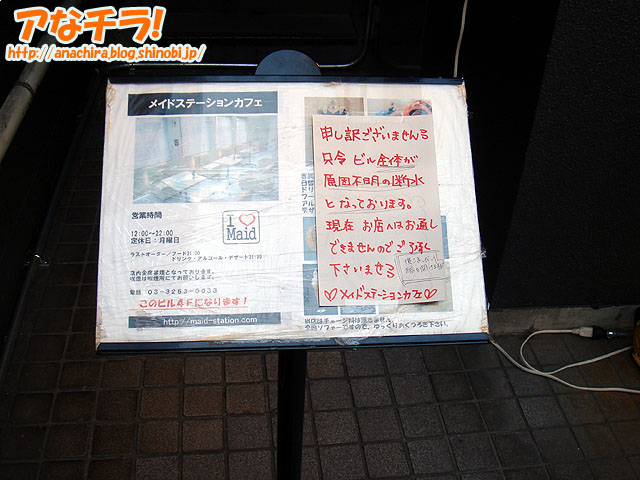 ビル全体が原因不明の断水だったので「メイドステーションカフェ」がサービスを中止。5月3日(木)の16時30分ごろに確認。 この断水がいつぐらいから始まって、いつぐらいに終わったのかは不明。また、同じビルの「ロイヤルミルク」「Tiare」などもサービスを中止していたのかも謎です。
