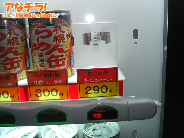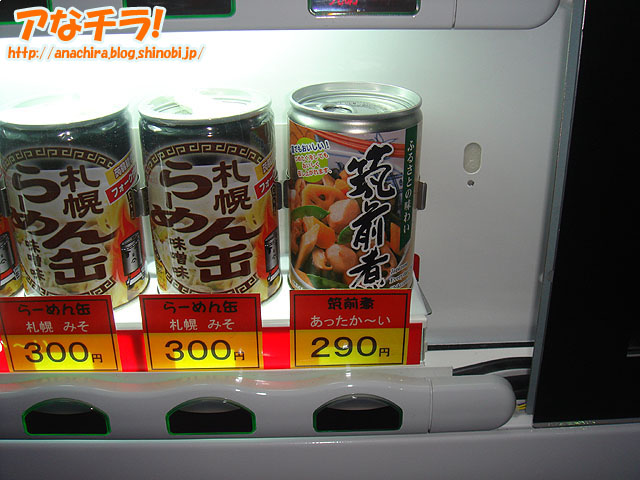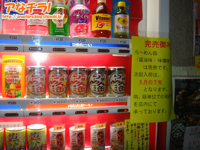 秋葉原で最近有名になった「ラーメン缶」を発売する自動販売機に3つ目が登場。場所はエフ商会横で、販売しているのはチチブデンキ、赤塚酒店と同じ「味噌味」と「醤油味」の2つ。恐らく、ゴールデンウィークの人出を当て込んでのモノだろう。 ●チチブデンキ チチブデンキのラーメン缶は残念ながら売り切れで、次回入荷は5月下旬予定。ただし、他にも人気のオデン缶ややきとり缶などがある。 赤塚酒店はラーメン缶に加えて筑前煮もある。ちょっと入り組んでいてわかりにくいので、コスプレショップ「コスメイト」を目印に探すといいだろう。 「エフ商会」横にも筑前煮がある、そして値札のみだが肉じゃがも準備中。 (k)