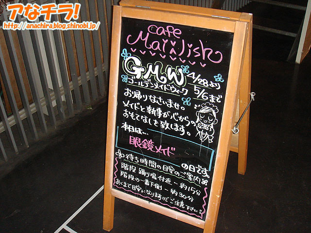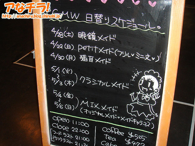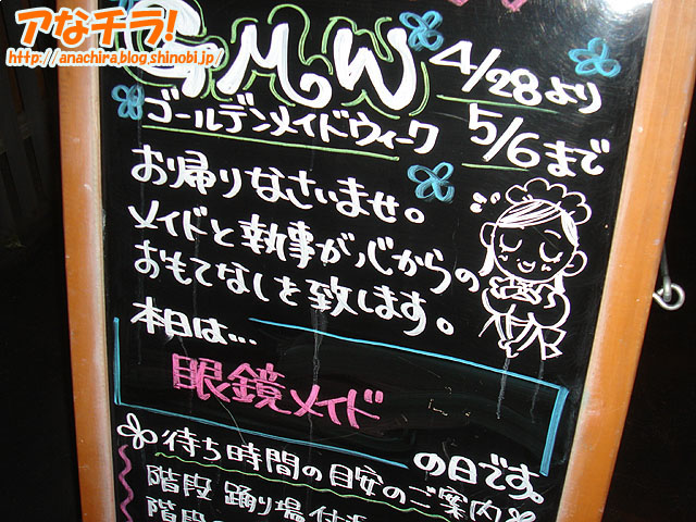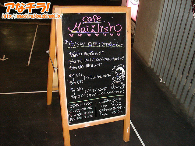 「メイドさんの衣装が日替わりで変更される」のがウリというイベント「GMW(ゴールデン・メイド・ウィーク)」が開催中。開催しているのはメイド喫茶「メイリッシュ」で、期間は4月28日(土)~5月6日(日)。 日替わりスケジュールは下記の通り。 イベントとは関係ないが、最近メイリッシュの看板に描かれているメイドイラストを見るのが楽しみになっている。かなり良い味を出していると思いませんか? メイド喫茶カフェメイリッシュ(Cafe Mai:lish) □関連記事 (k)