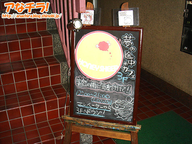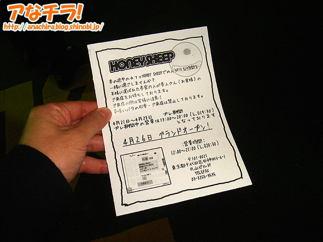 今月26日にグランドオープンした夢の途中カフェ「HONEY SHEEP」のフライヤー。記載内容は「店の紹介」「プレオープン期間」「グランドオープン日」など。すでに終了したプレオープン期間の記載もあるので、このバージョンのフライヤーが配布される期間は短いと思われる。 このフライヤーを手にすることができた人は幸運なのかもしれない。 ちなみに、このフライヤーを配布していた「HONEY SHEEP」の夢案内人(メイドさん)は羊の耳カチューシャを付けていた。 (k)