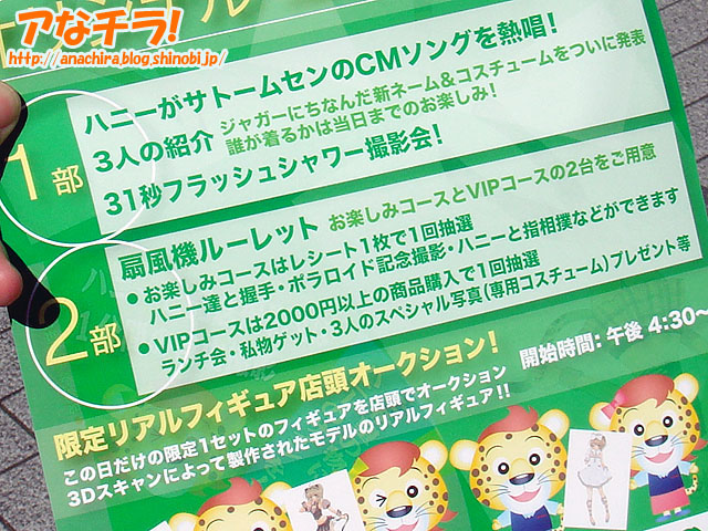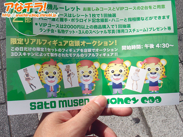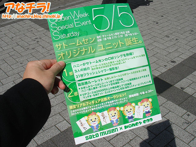 ハニーエッグによる「サトームセン オリジナルユニット」が5月5日にデビューするというチラシ。ユニットは3人組で、サトームセンのCMソングも歌うとのこと。告知チラシを配っていたのは「葵とうか」さんで、TVアニメ「機会神飛翔デモンベイン」の「アル・アジフ」の衣装を着ていた。 5月5日はサトームセン駅前1号店で、デビューイベントも兼ねたイベントも予定されている。内容は大きく3つあり、「ユニット紹介」「ハニーとのランチ会も当たる扇風機ルーレット」「限定フィギュア店頭オークション」。 ・1部 ハニーエッグのファンならば見逃せない内容ではないだろうか。ユニットの3人が誰になるのか、どのようなCMソングなのか楽しみにしてまっていて欲しいとのこと。 サトームセン (k)