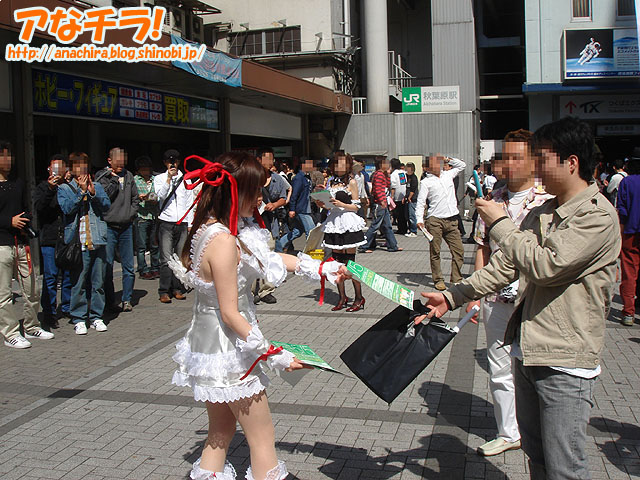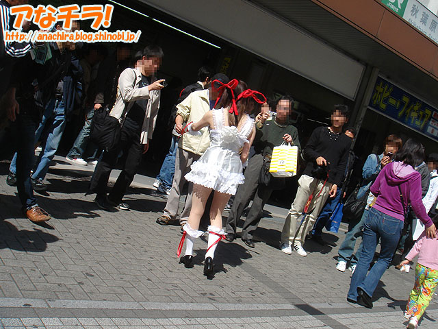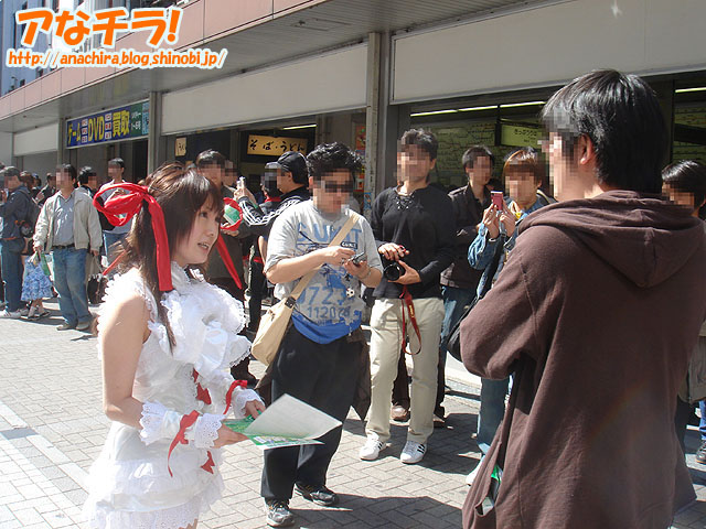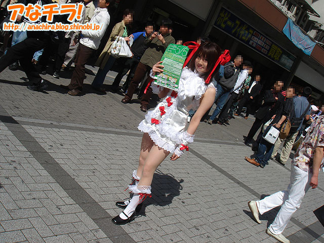 14歳の少女がコスプレパフォーマンス。キャラクターはTVアニメ「新世紀エヴァンゲリオン」の「アスカ・ラングレー」で、衣装は「第3新東京市立第壱中学校」の夏服。4月29日(日)に見かけました。 話を聞いたところ、秋葉原に来たのは「アニメイトに買い物に来ました」といい、コスプレは「(秋葉原なら)いいかなーと思って♪」と軽いノリで答えてくれた。なんでも9歳の頃から秋葉原に遊びに来ていて、コスプレ経験も長いという。 ちなみに、彼女は黒いゴスロリ服を着た友達(14歳)と大勢のカメラマンから撮影をうけたといた。残念ながら友達がBlog掲載はNGと言う理由で撮影風景の写真は掲載していません。 秋葉原で14歳の少女がコスプレしているのを見かけたのは2回目だが、素人の女の子がコスプレしているのを見かけたのは初めて。気軽にコスプレして歩く事が出来る街としての認識されているのかもしれない。 □関連記事 (k)