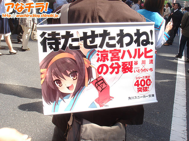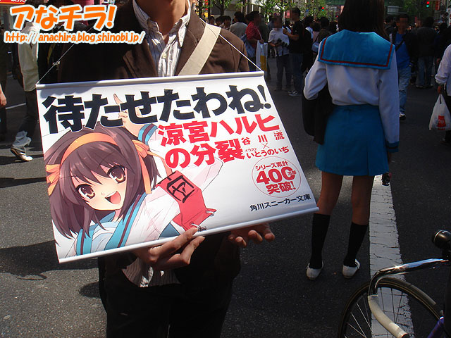 「SOS団三次元支部」が秋葉原全体を使って「かくれんぼ」をして遊んでいた。参加人数は同団体の団長からの報告によると31人。これは今まで見かけた「秋葉原でかくれんぼ/鬼ごっこ」の中では最大人数となっている(アなチラ比較)。 同団体は小説「涼宮ハルヒの憂鬱」のファン団体の一つで、「涼宮ハルヒが好き勝手やって非日常をよんでるあの二次元のSOS団を、こっちの世界でもそっくりそのままやる」というのが目的。Webサイト上の団員数は約20人で、新入団員も募集中という。 今回の「かくれんぼ」は第2回目の活動。「仲間と(携帯電話で)連絡を取りながら探しています」「秋葉原は広いから楽しいです」と笑顔で教えてくれた。また、参加者の中には「北高」の制服を着たり、背中に「小説の宣伝幕」を背負っていたりしていた人もいた。 ちなみに、第一回目の活動実績は今月8日に行われた「大人数でハレ晴れユカイを踊るOFF」への参加。今後の活動予定は、「朝比奈みくる撮影会(現在みくる探し中)」、「怪奇スポットを巡る」、「映画撮影」などがあるが、具体的な開催日は決定していない。 「涼宮ハルヒ」の世界を味わってみたいという人は「SOS団三次元支部」に入団してみてはいかがだろう(一切の責任は取れませんが…)。 □関連記事 (k)