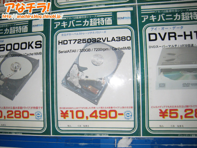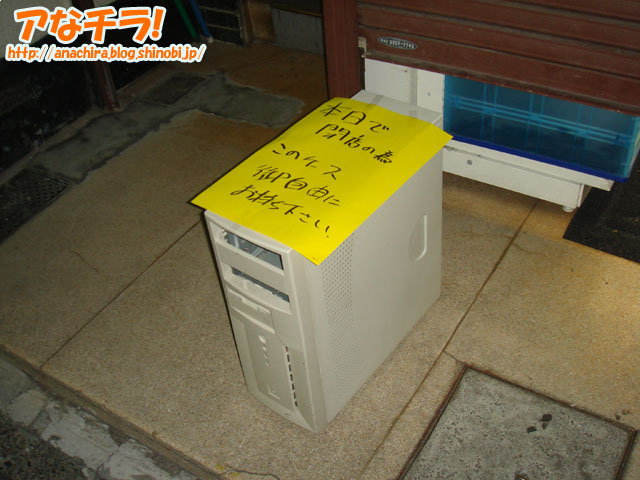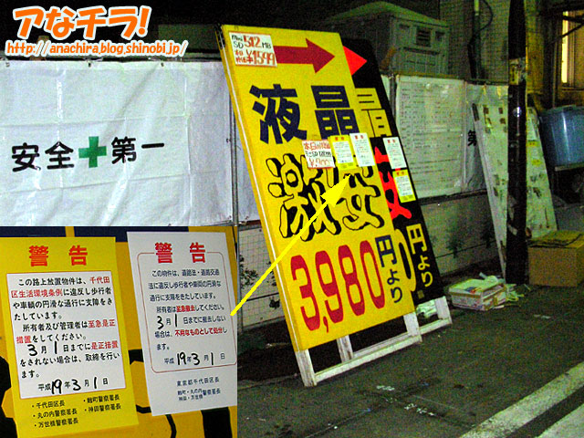 あきばんぐの「液晶激安」看板に是正警告が出ている。最悪は撤去されるかもしれない。 同店はもともと光学メディアや2chグッズの販売で有名だが、最近は中古液晶ディスプレイの販売に力をいれており、店舗前にも「液晶激安3,980円より」とでかでかと書いた移動式A型看板を2種類いつも立てている。警告されたのは、その2つの看板。もっとも警告といっても看板の内容についてではなく、設置状態についてのもの。 1日(木)20時の段階で、看板は店舗の入っているビル隣の工事現場付近に閉じた状態でたてかけてあるが、そこには「千代田区生活環境条例に違反(中略)しています。(中略)3月1日までに是正措置をされない場合は、取り締まりを行います。」「所有者は至急撤去してください。3月1日までに撤去しない場合は、不用なものとして処分します」と書かれた千代田区長と万世橋警察署長名の警告ステッカーが貼られている。ステッカーは3月1日付。1日は同店は棚卸しで休業しており、外に看板が放置されていることへの警告らしい。 警告通りとすれば明日には強制撤去される可能性もあるが…。現実的には役所が早朝から撤去作業にやってくるとは思えず、このまま明日の朝になって店舗が営業開始された段階で警告ステッカーが剝がされて終わりかもしれない。 ちなみに千代田区生活環境条例では置き看板類の放置等について罰則規定があり、氏名や住所等の公表と告発、5万円以下の罰金が科せられることになっている。 あきばんぐ (f)