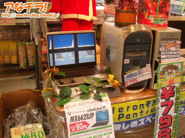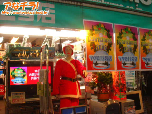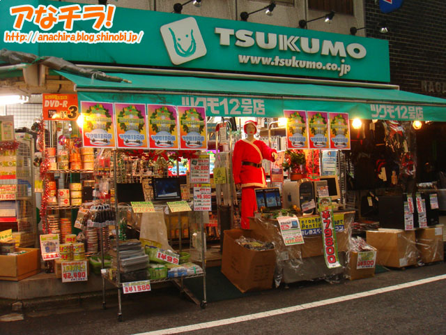 自作PCパーツショップとしてはXmas装飾に凝っている店。店内にはXmasソングも流れていました。 秋葉原の店はパーツショップもホビーショップもいまひとつXmasに縁がない。質実剛健なのか店頭ではいつも通りおすすめ商品を並べており、店内ではいつもと同じ店内放送が流れている。新宿や銀座などと比べるとどうしても地味に見えてしまう。 そんな中、中古PCを販売しているツクモ12号店は比較的Xmasらしい装飾をしていた。ちなみに他のツクモ店舗ではここまで装飾していないので、この店舗が独自に行っているようだ。 まぁこれはXmasに限ったことではなく、正月やバレンタインでも状況は似ている。 九十九電機株式会社 (k)
