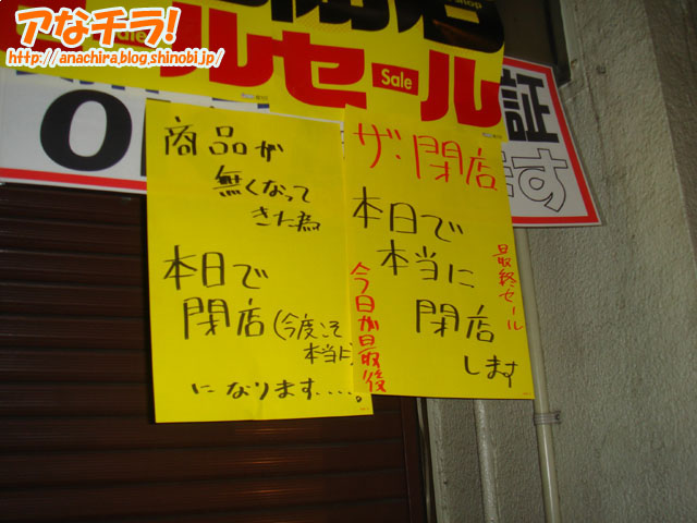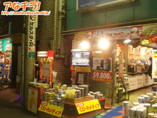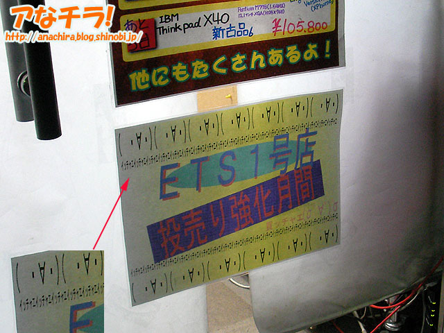 中古パソコン店のETS 1号店の扉に「ETS 1号店 投売り強化月間 買っチャエ(σ゜∀゜)σ」と書かれた、なかなか大胆な貼り紙が出ている。 物売る商売をやりながら表向きに「投売り」と言ってしまうのはかなり大胆。もともと安値をウリにする中古店とはいえ、かなり挑戦的といえるだろう。この貼り紙には、小さい顔文字とともに「イッチャエイッチャエ」という連続した文字列もあって、ずいぶんとノリは軽い。 安値通販店として有名なPC-Success破産騒動で秋葉原が騒然となった直後だけに、余計に大胆に見える部分もある。 □ETS (f)